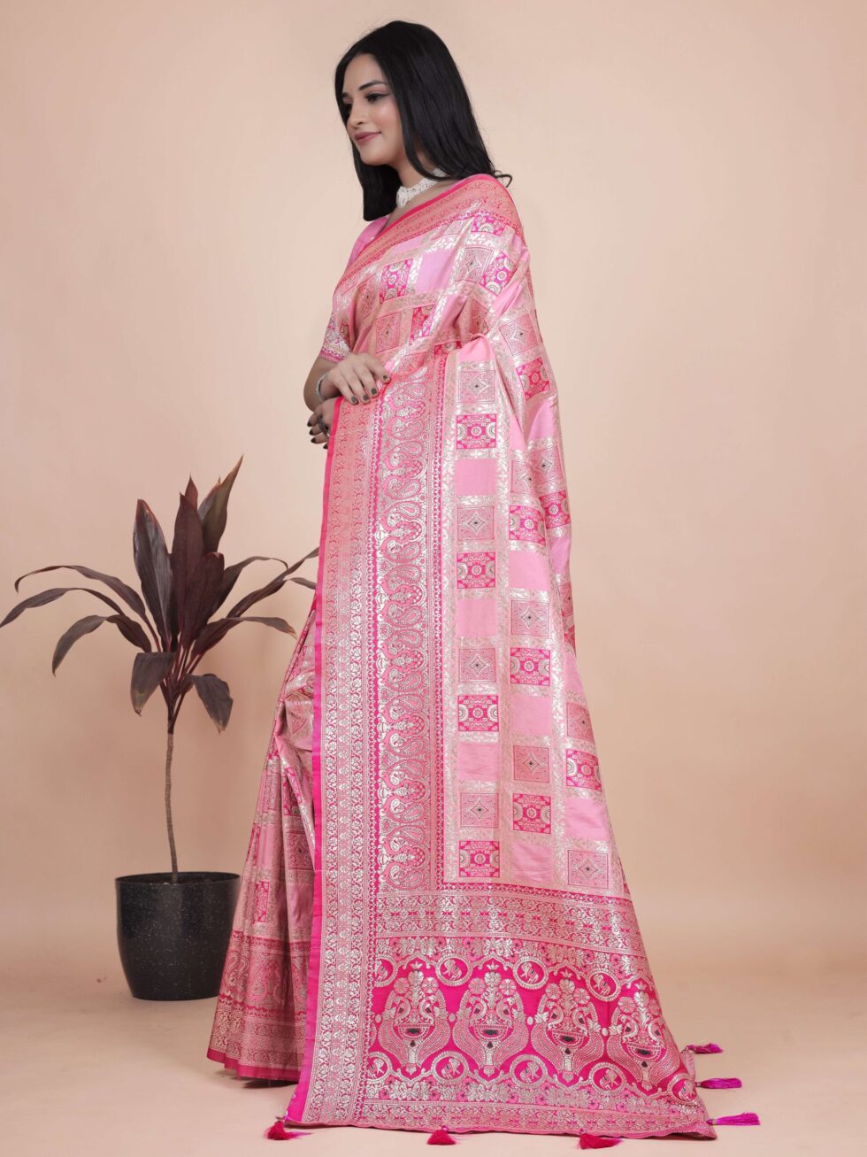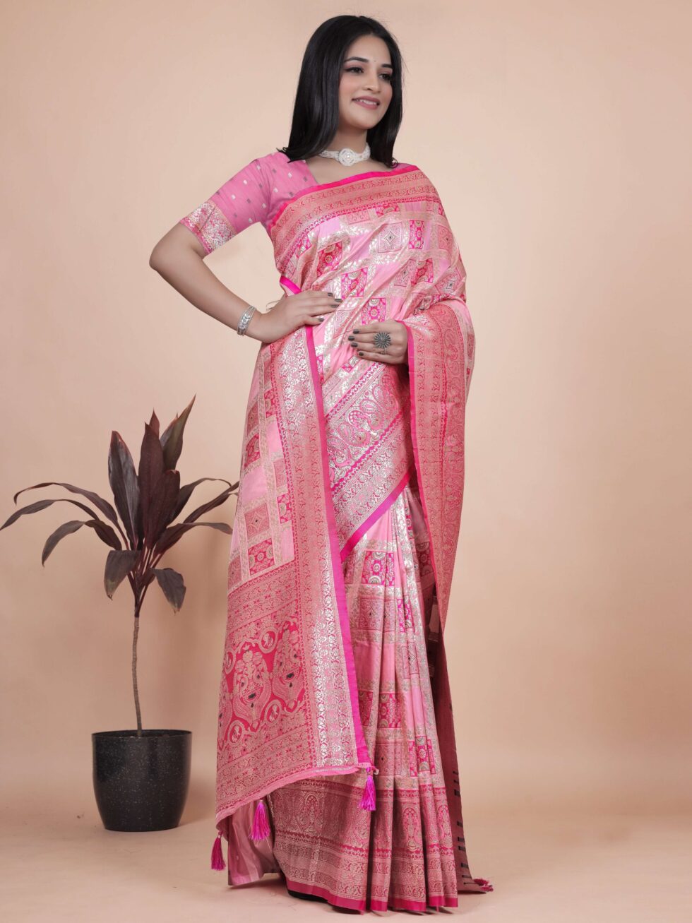 Baby Pink Banarasi Silk Saree with Silver Zari Weaving | Wedding & Festive Wear | Elegant Traditional Designer Saree