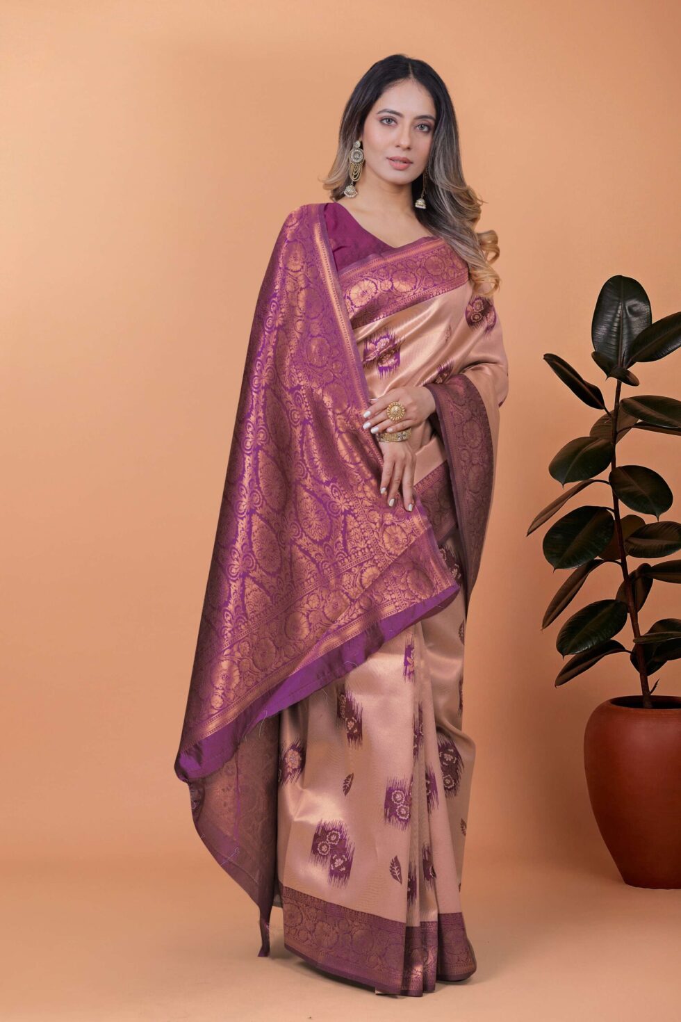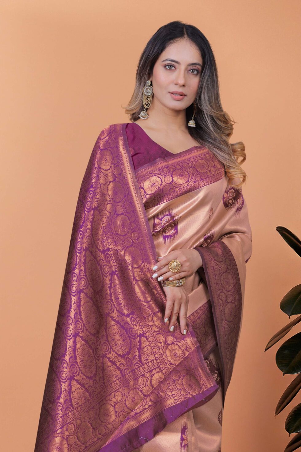 Beige & Plum Banarasi Silk Saree with Zari Weaving | Elegant Traditional Saree for Weddings, Festivals & Ethnic Occasions