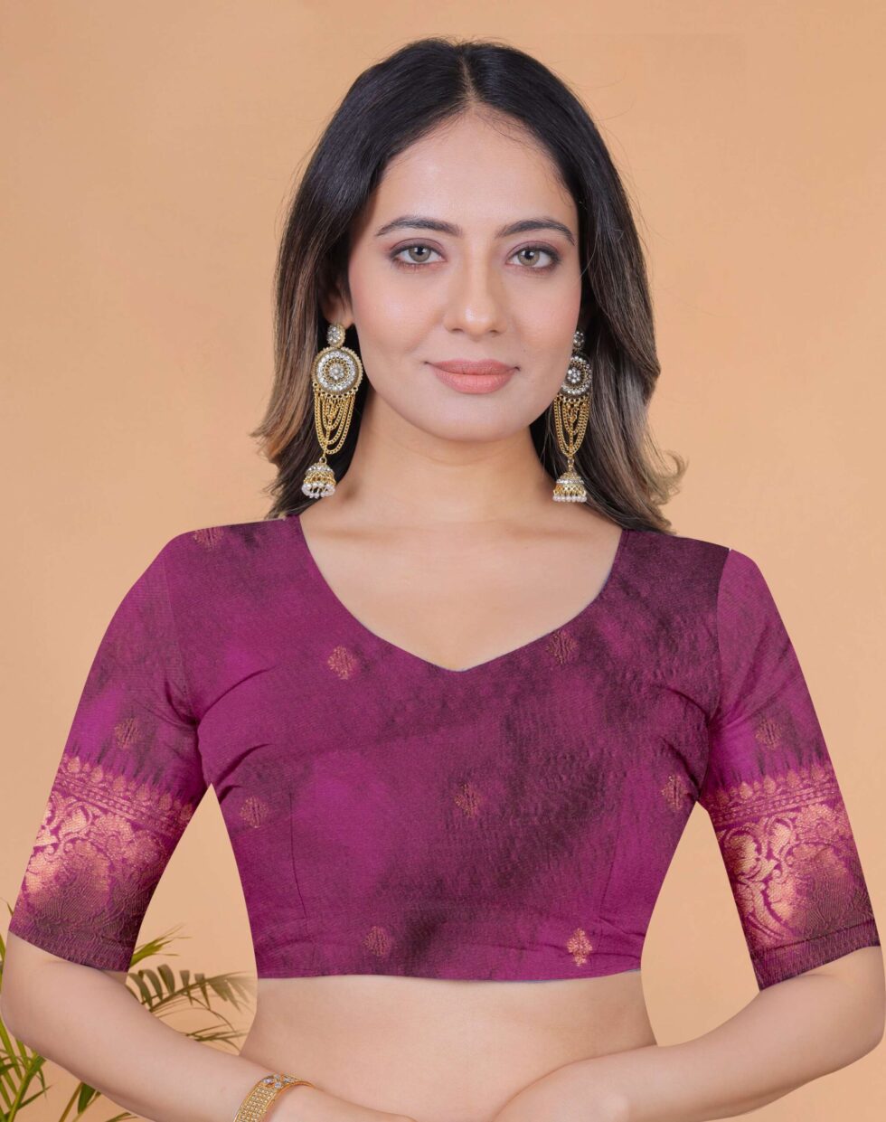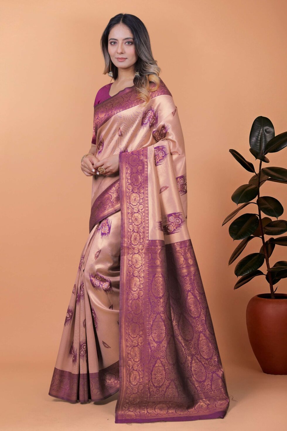 Step into sophistication with this Beige & Plum Zari Woven Banarasi Silk Saree, a perfect blend of traditional artistry and modern elegance. The soft beige silk body is adorned with delicate plum zari floral motifs, creating a subtle yet regal look.