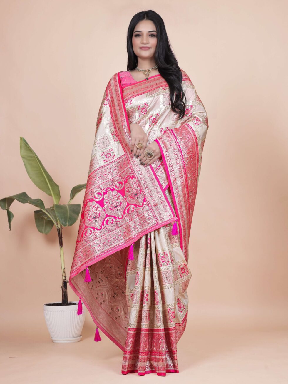 Step into royal elegance with this Cream and Pink Banarasi Silk Saree with Rich Silver Zari Weaving, designed for women who love timeless tradition with a touch of grandeur. The luxurious cream silk base is adorned with intricate silver zari block motifs, lending sophistication and heritage appeal.