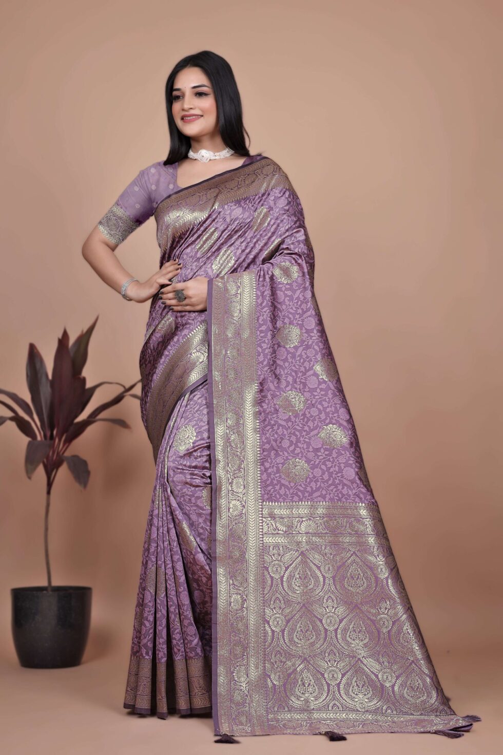 Add regal charm with this lavender Banarasi silk saree, featuring gold zari butti motifs, ornate border, and majestic pallu. Ideal for weddings, festivals, engagements, and cultural events, with matching unstitched blouse included.
