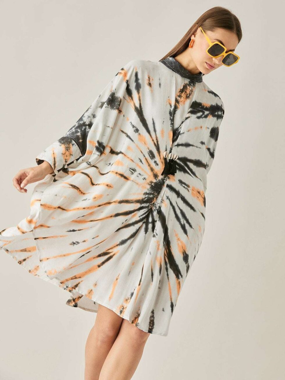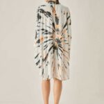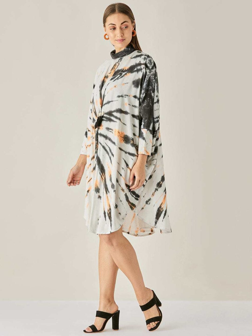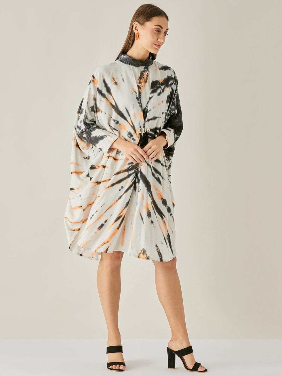 Women’s Cotton Tie Dye Print Knee Length Mock Neck, Long Sleeve Kaftan Drees ( Black White )