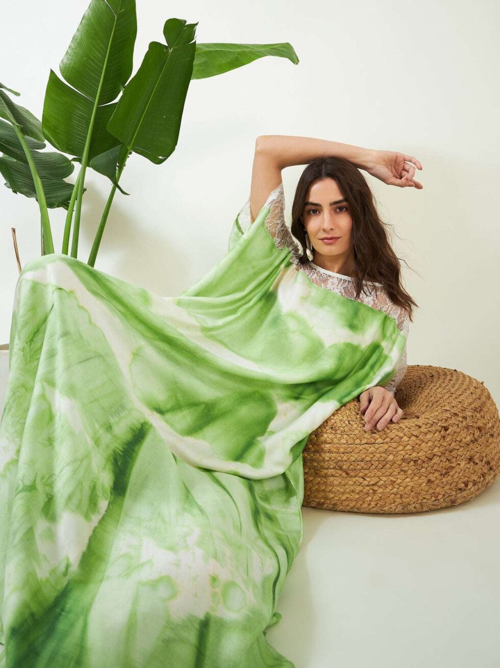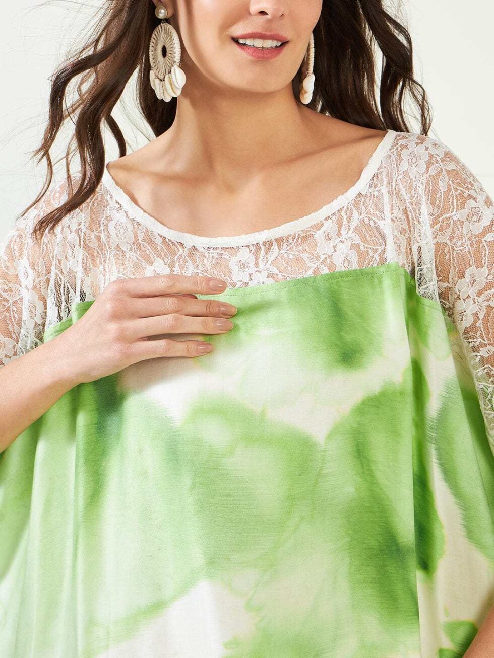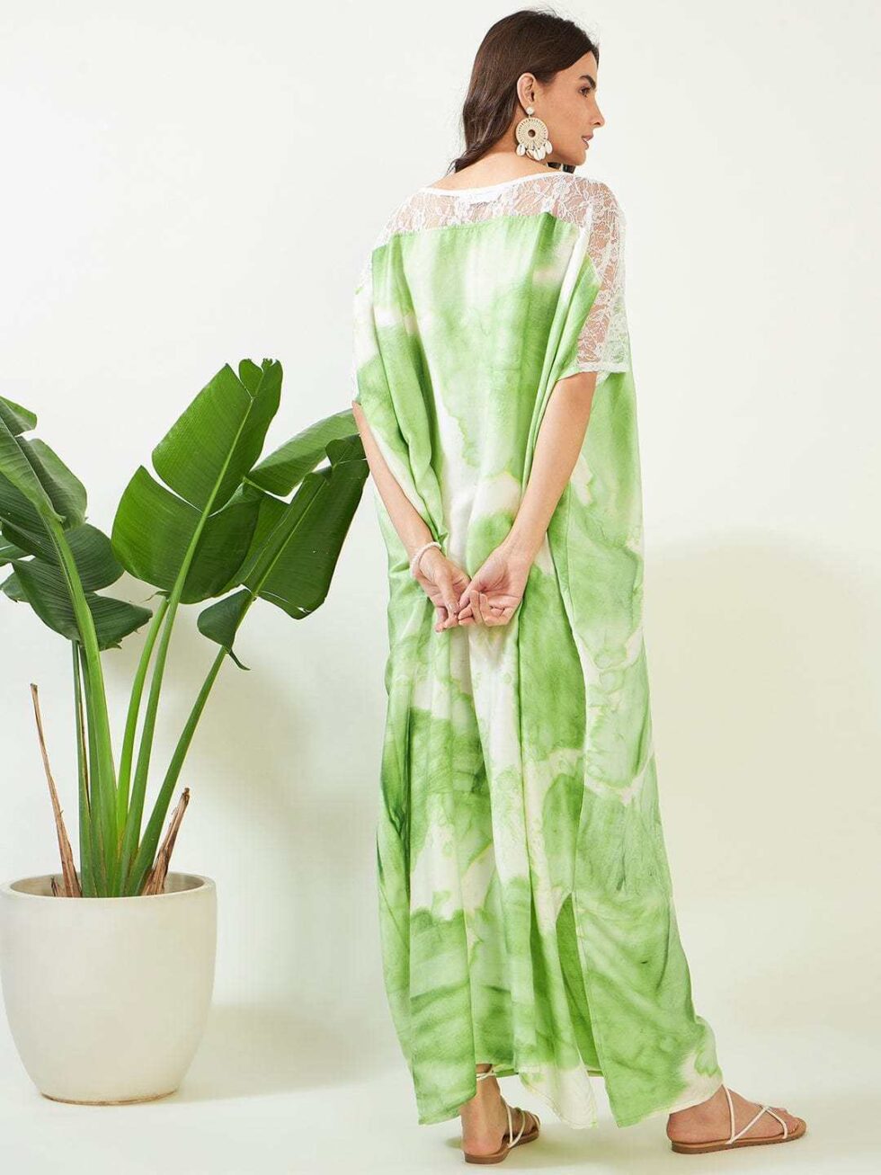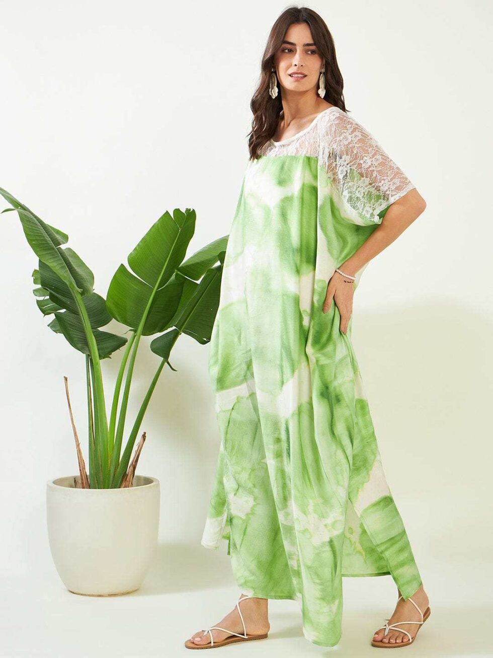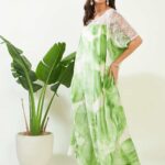 Women’s Cotton Tie Dye Print Lace Trim, V-Neck, Full Length, Beach Casual Wear, Spring Collection Kaftan ( Green White )