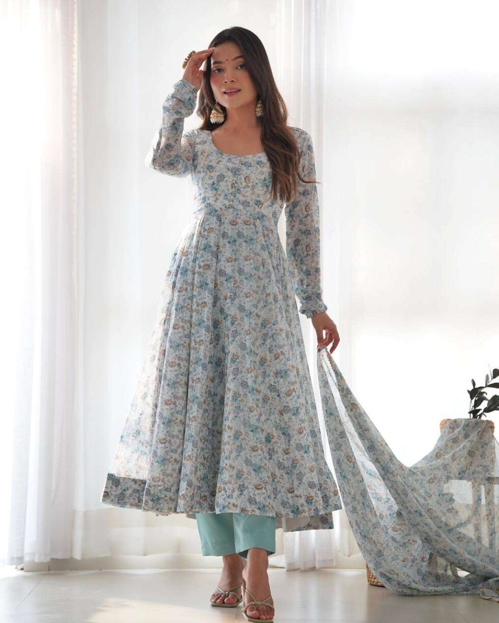 Womens Crunchy Silk Anarkali Kurti with Pant & Dupatta Set
