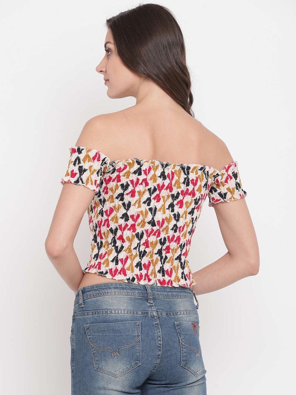 Women’s Rayon Printed Off-Shoulder Smocked Crop Top Short Sleeve Casual Styles Tank Top (FREE SIZE) Multi31
