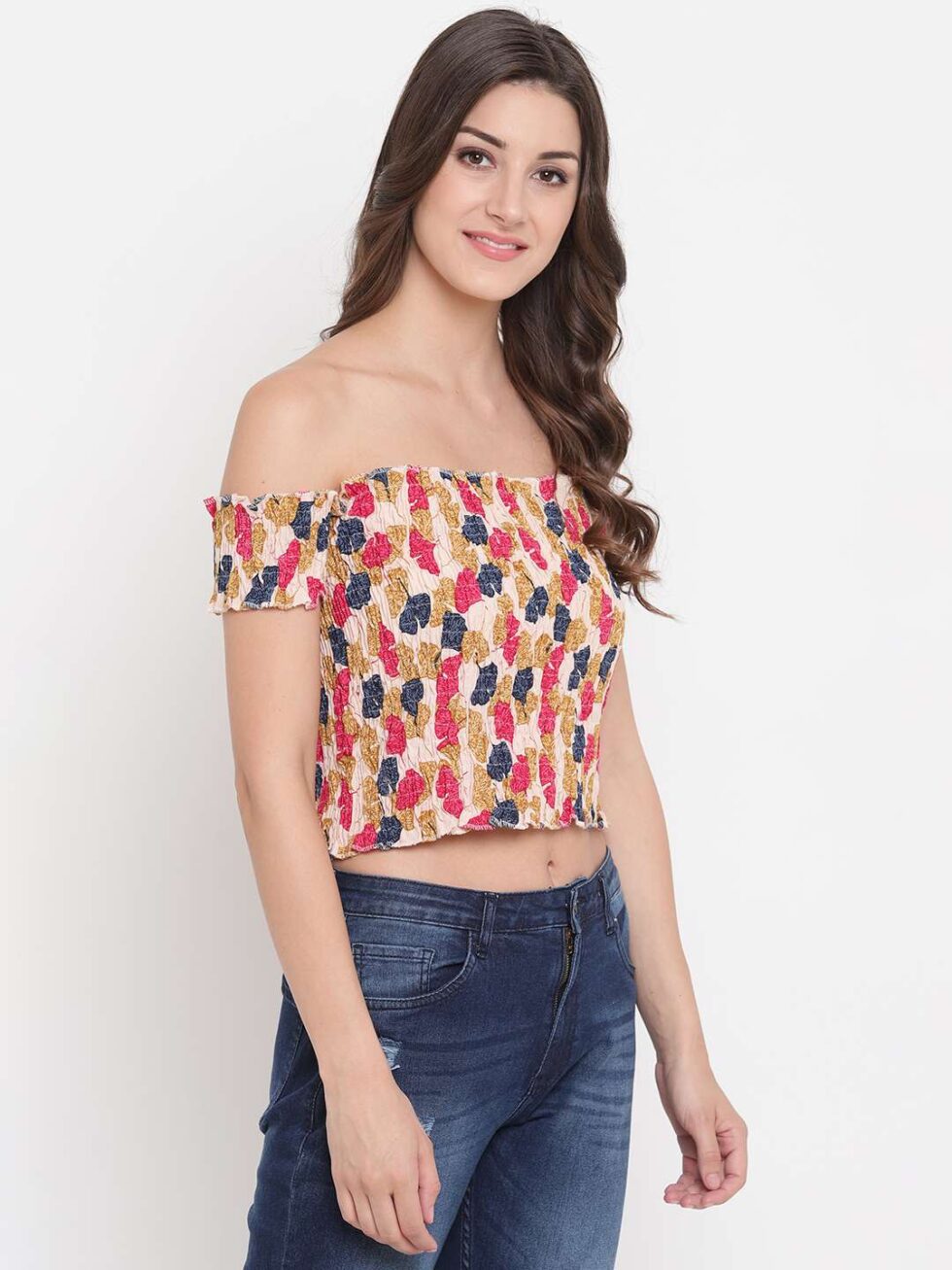 Turn heads with this chic off-shoulder smocked crop top. Featuring a flattering shirred fit, ruffled trim, and vibrant color, it?s perfect for pairing with high-waisted jeans, skirts, or shorts?ideal for both casual outings and dressy occasions.
