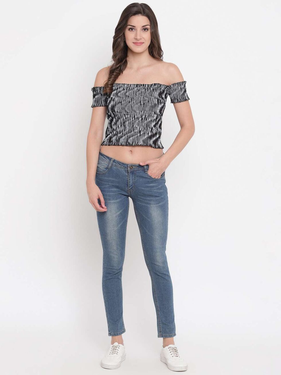 Turn heads with this chic off-shoulder smocked crop top. Featuring a flattering shirred fit, ruffled trim, and vibrant color, it?s perfect for pairing with high-waisted jeans, skirts, or shorts?ideal for both casual outings and dressy occasions.